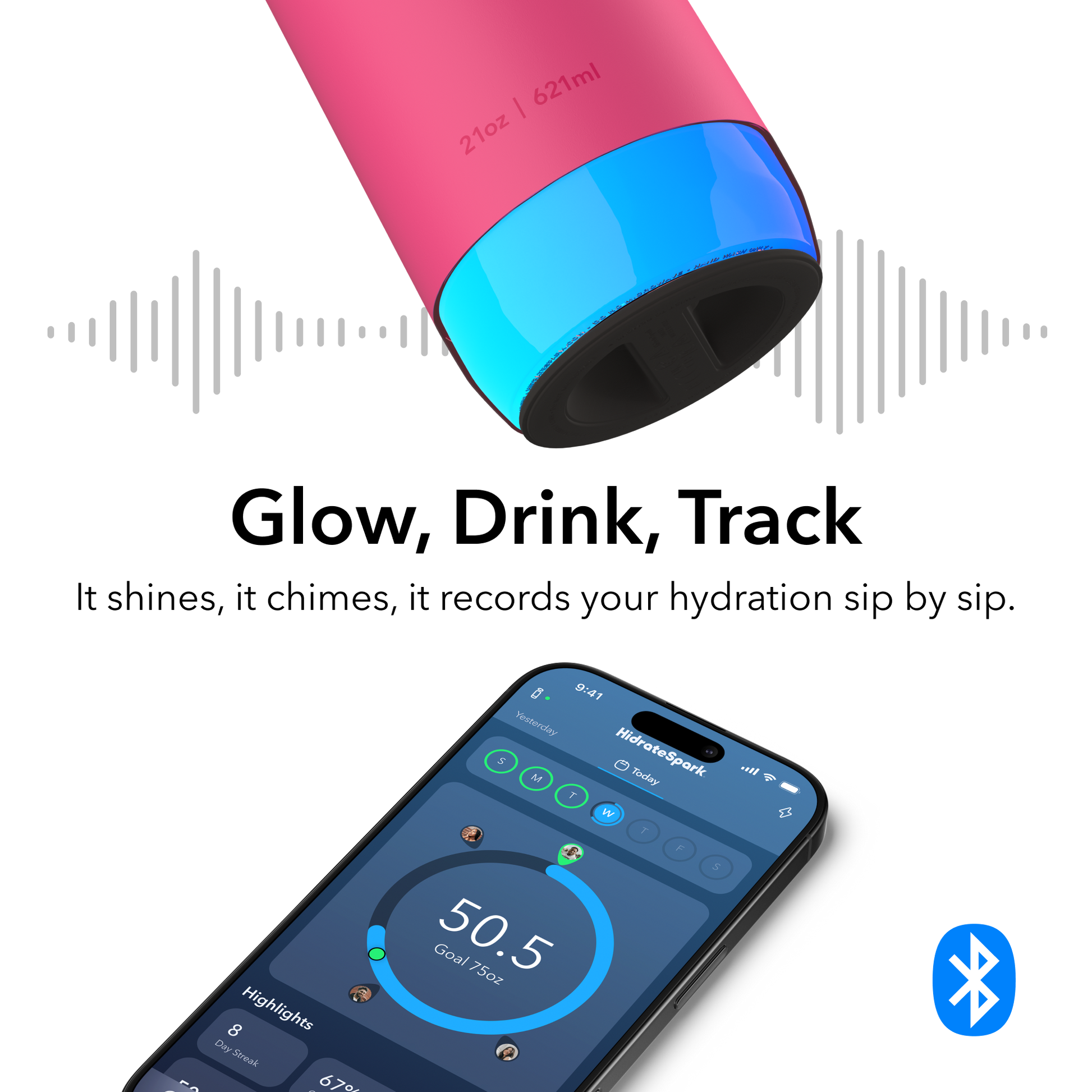 💡 Smart Hydration Tracking: Advanced SipSense technology and a glowing ring remind you to drink and record each sip, making hydration simple and fun.